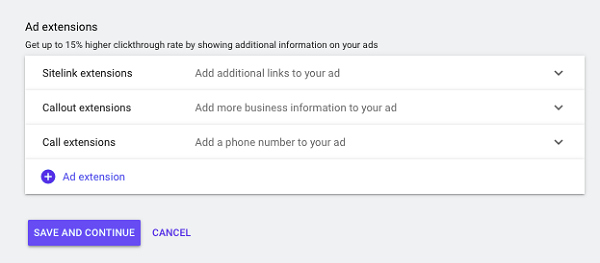 最常用或受歡迎的是 「網站連結額外資訊」(SitelinkExtensions)。當你生意有促銷或特別的產品或服務時,可加進去吸引別人按下連結。 若果嫌麻煩或未考慮到這些額外資訊,我建議先加入「電話額外資訊」(CallExtensions),直接寫下自己生意的聯絡電話便可,方便快捷又簡單,同時佔更大板塊。 第11步: 設定廣告群組
